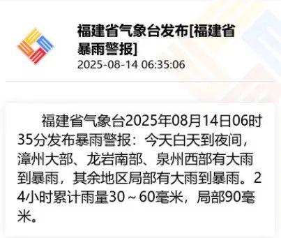 福建省气象台8月14日6时35分发布暴雨警报。
