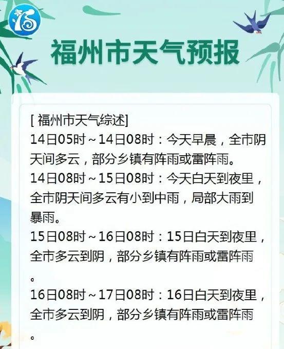 14日白天到夜间,漳州大部、龙岩南部、泉州西部有大雨到暴雨,其余地区局部有大雨到暴雨。24小时累计雨量30~60毫米,局部90毫米