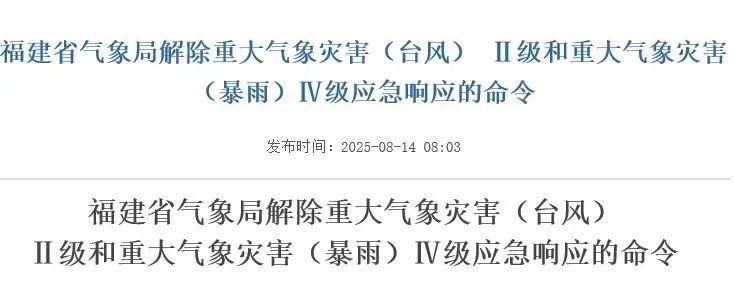 福建省气象局决定于2025年8月14日8时起解除重大气象灾害(台风)Ⅱ级和重大气象灾害(暴雨)Ⅳ级应急响应。