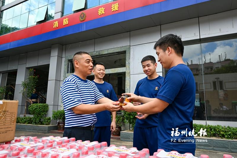 “谢谢你们送来的清凉物资,太及时了!”13日上午,福州市消防救援支队特勤大队一站内,消防指战员们接过“爱心茶摊”送清凉小分队递来的瓶装水和蜂蜜,脸上洋溢着笑容。由送清凉活动主办方与爱心企业永辉超市组成的小分队走进这里,为常年奋战在救援一线的“蓝朋友”送去夏日里的贴心关怀。