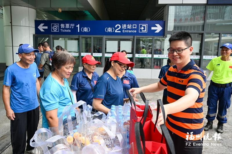 在福州火车站南广场,爱心企业向志愿者发放清凉礼包。