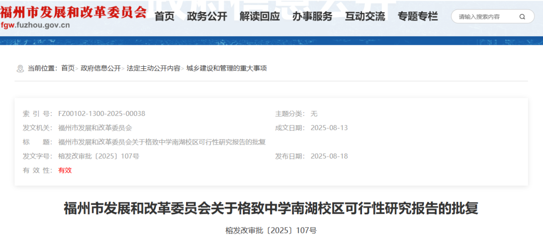 日前,福州市发展和改革委员会发布了《福州市发展和改革委员会关于格致中学南湖校区可行性研究报告的批复》。