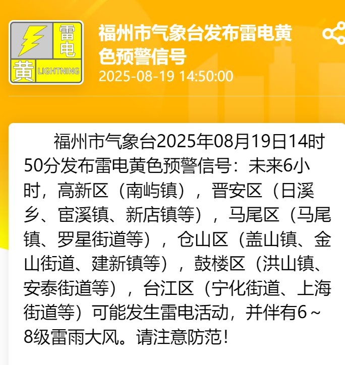 福州市气象台8月19日14时50分发布雷电黄色预警信号。