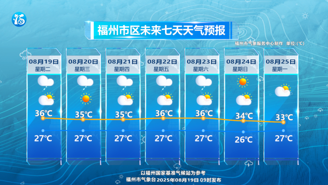 未来一周受副热带高压控制,福州各地将维持高温天气,大部地区最高气温可达(或超过)35℃,福州主城区最高温可达36℃~37℃左右,中午前后的高温时段尽量减少外出,户外作业或活动务必注意做好防晒措施,谨防中暑。