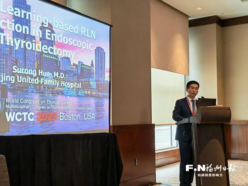 花苏榕在世界甲状腺癌大会上发言,展示喉返神经AI识别技术研究成果。