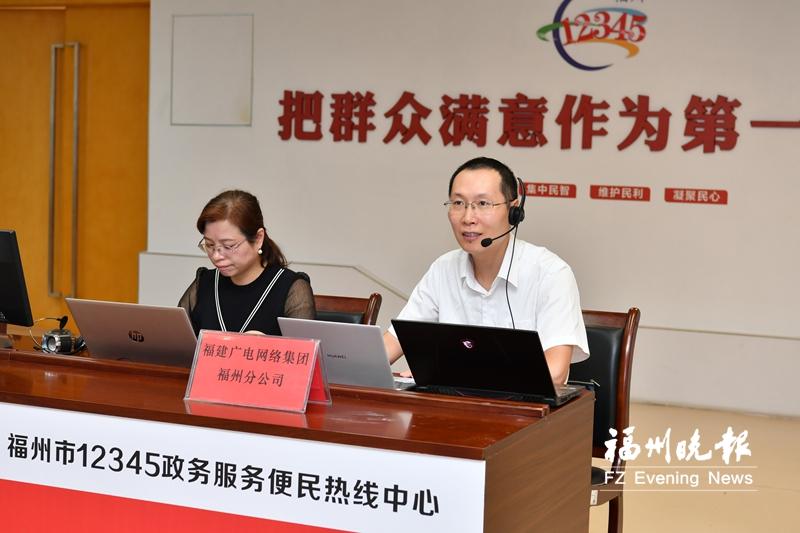 21日,福建广电网络集团福州分公司副总经理林声威(右)在回复12345热线。