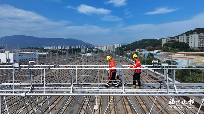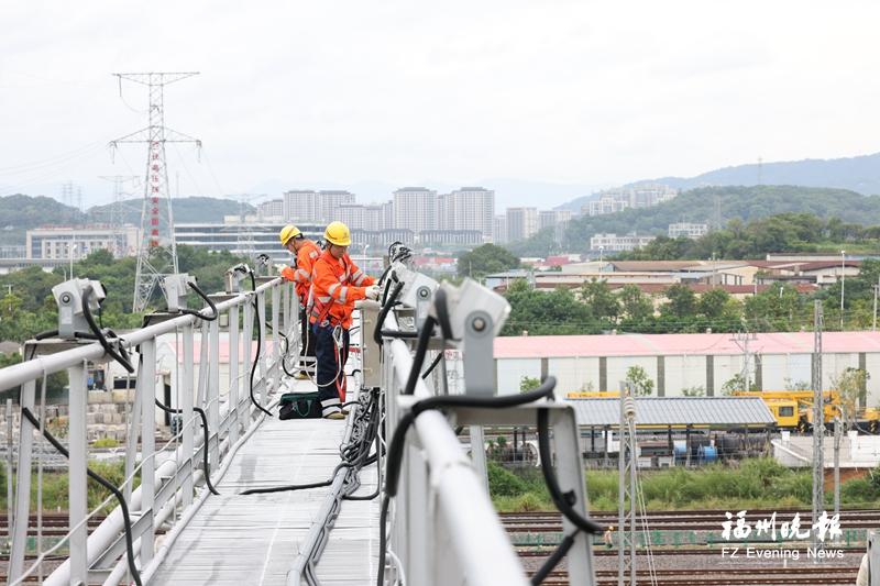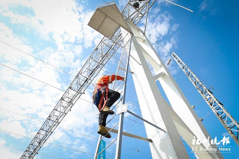 灼热的气流炙烤着福州南动车所,午后气温逼近37℃。22米高的灯桥在骄阳下如沉默的钢铁巨人,在寂静中泛着微光。此时,是动车组列车没有出入库的短暂间隙,亦是中国铁路南昌局集团有限公司福州供电段福州南供电工区的副工长张杰与工友们面对“烤”验的黄金两小时。他们的身影在热浪中攀援而上,维系着灯桥的明亮,也维系着暮色四合之后,高铁动车检修基地——这座被誉为“陆地航母”的有序脉搏。