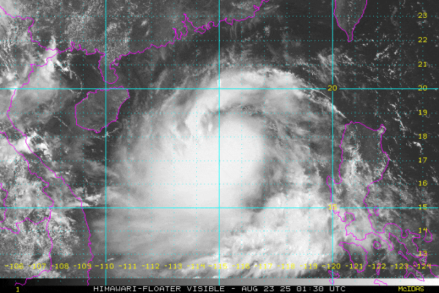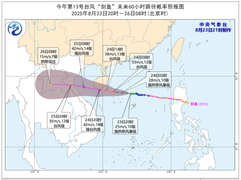 今年第13号台风“剑鱼”已于今天(23日)下午5点钟加强为强热带风暴级,其中心位于海南省三亚市偏东方大约550公里的南海中部海面上,就是北纬17.6度、东经114.7度,中心附近最大风力有10级(25米/秒),中心最低气压为985百帕,七级风圈半径150~220公里。