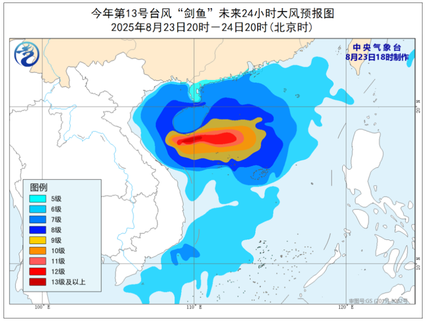 大风预报:8月23日20时至24日20时,南海大部及西沙群岛和中沙群岛、北部湾、琼州海峡、海南岛沿海、广西沿海、广东西部沿海将有6-8级大风,其中南海西北部和中西部及西沙群岛部分海域、海南岛南部沿海的风力有9~11级,“剑鱼”中心经过的附近海域或地区的风力可达12~14级、阵风15~16级。