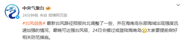 中央气象台提醒,“剑鱼”路径与此前相比有所北调,或将擦过或登陆海南岛,要做好相关防范措施。