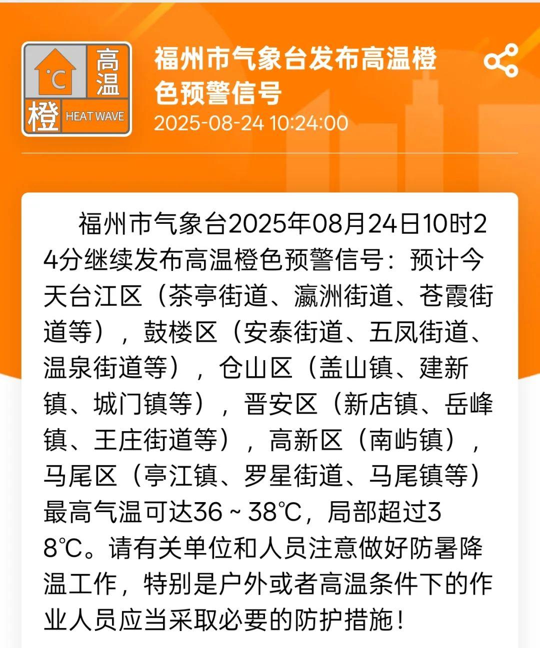 刚刚,福州发布高温橙色预警,今天局部超过38℃。