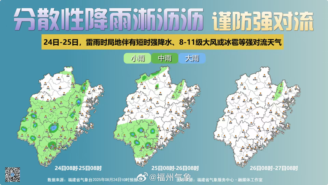 据福建省气象台消息,24日,全省多云到阴,大部有阵雨或雷阵雨,中部沿山地区和西南部有分散性中到大雨,局部暴雨。