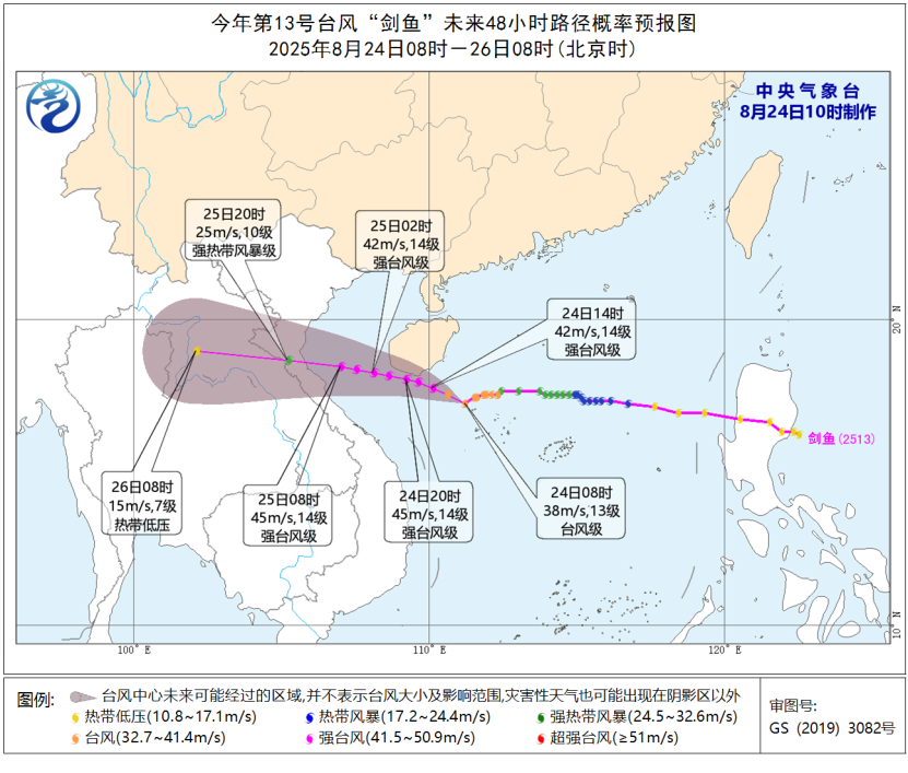 大风预报:8月24日14时至25日14时,南海西部、西沙群岛附近海域、北部湾、琼州海峡、海南岛及沿海、广西沿海、广东中西部沿海将有6-8级大风,其中南海西北部和中西部的部分海域、北部湾中部和南部海域、海南岛沿海的风力有9~11级,“剑鱼”中心经过的附近海域或地区的风力可达12~14级、阵风15~16级。
