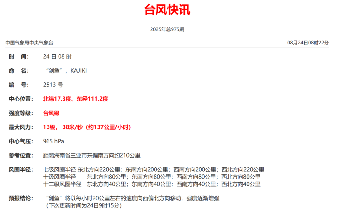 预计,“剑鱼”最强可达强台风级(14~15级,42~48米/秒),并将于24日下午至傍晚在海南陵水到乐东一带沿海登陆(13~14级,40~45米/秒,台风级或强台风级),也有可能经过海南岛南部近岸海面,然后逐渐趋向越南中北部沿海。