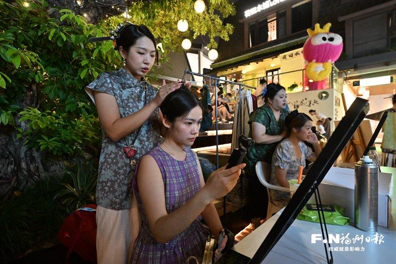 现在,无论在烟台山还是在三坊七巷、上下杭等街区,都可以看到头戴三条簪的游客在拍照。旅拍店纷纷推出相关打卡活动,比如“古厝拾光国潮旅拍”“银簪映新裳”等,让游客在传统与现代的交织中留下美好回忆。不久前,“华妃”蒋欣也来到福州,连发“18宫格”,分享她在这座城市的美好时光。