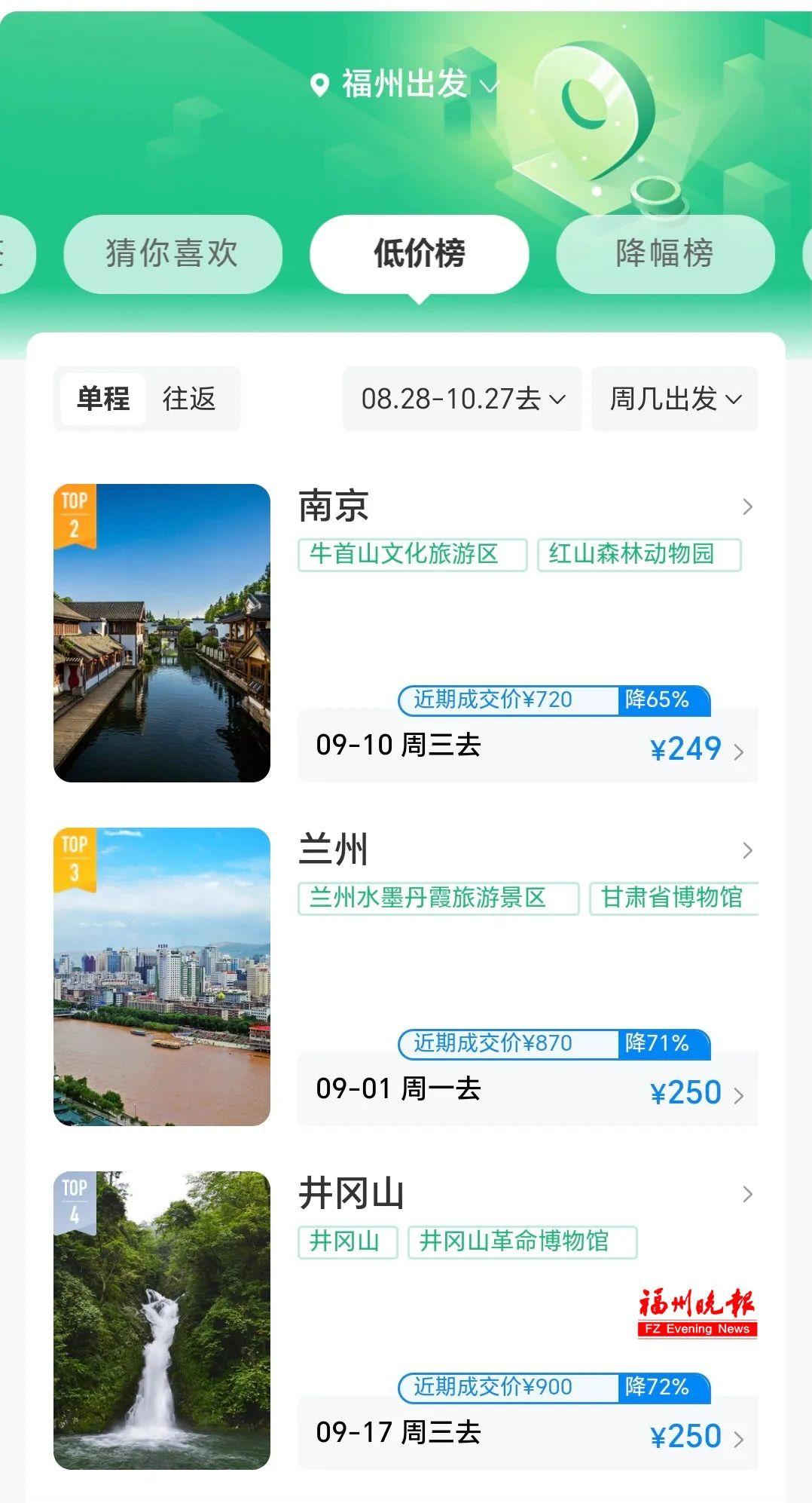 随着暑假即将结束,从8月底到国庆假期前的一段时间,福州机票价格进入“大跳水”状态。