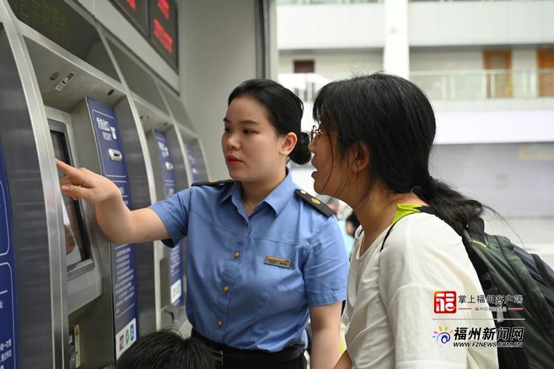 福州站售票人员正在帮助旅客使用自助售票机。通讯员 韩毅 摄