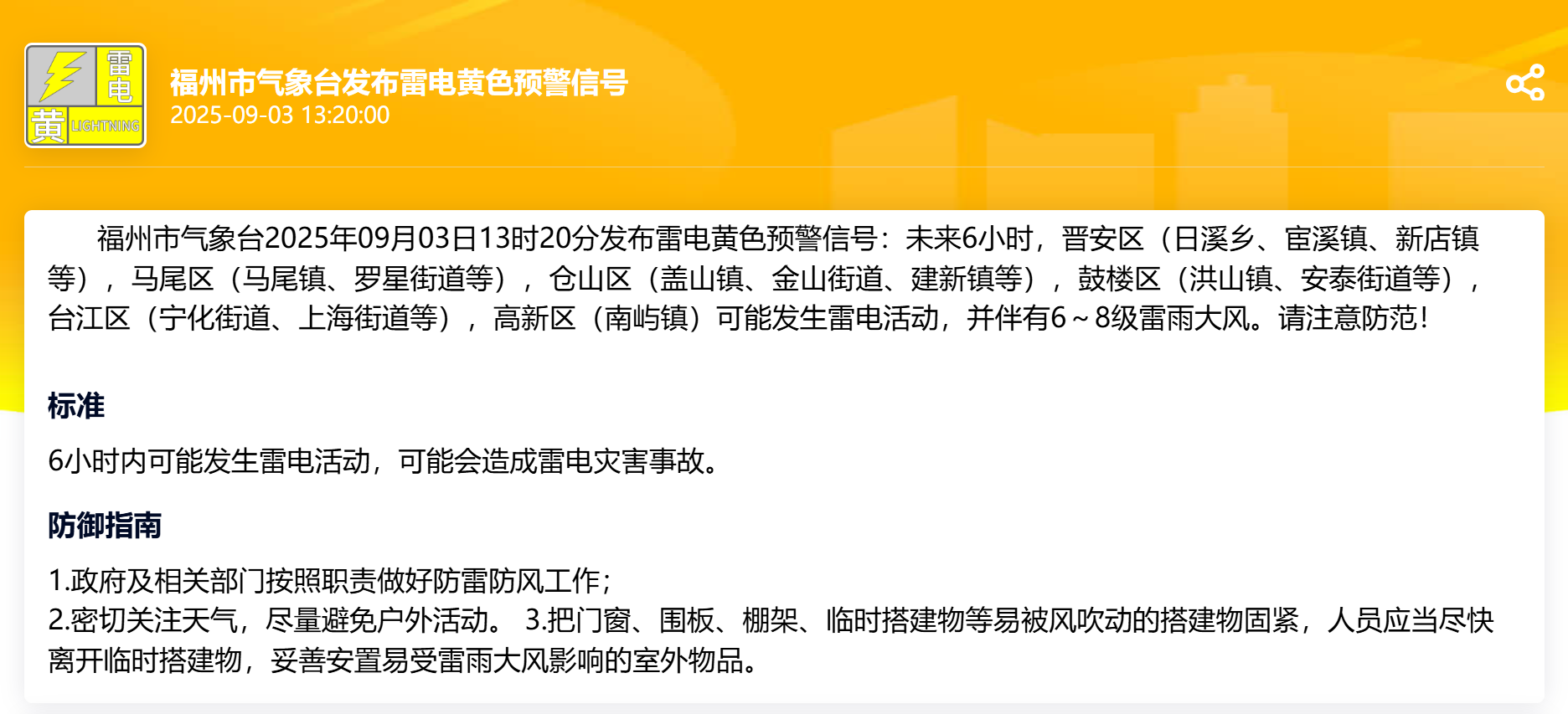 福州市气象台2025年09月03日13时20分发布雷电黄色预警信号:未来6小时,晋安区(日溪乡、宦溪镇、新店镇等),马尾区(马尾镇、罗星街道等),仓山区(盖山镇、金山街道、建新镇等),鼓楼区(洪山镇、安泰街道等),台江区(宁化街道、上海街道等),高新区(南屿镇)可能发生雷电活动,并伴有6~8级雷雨大风。请注意防范!