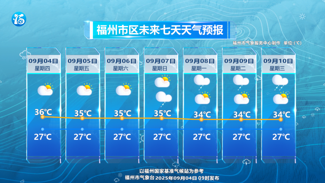 未来一周市区高温在35℃高温线附近徘徊,低温27℃左右,闷热的体感几乎会贯穿全天,户外活动要注意防暑。