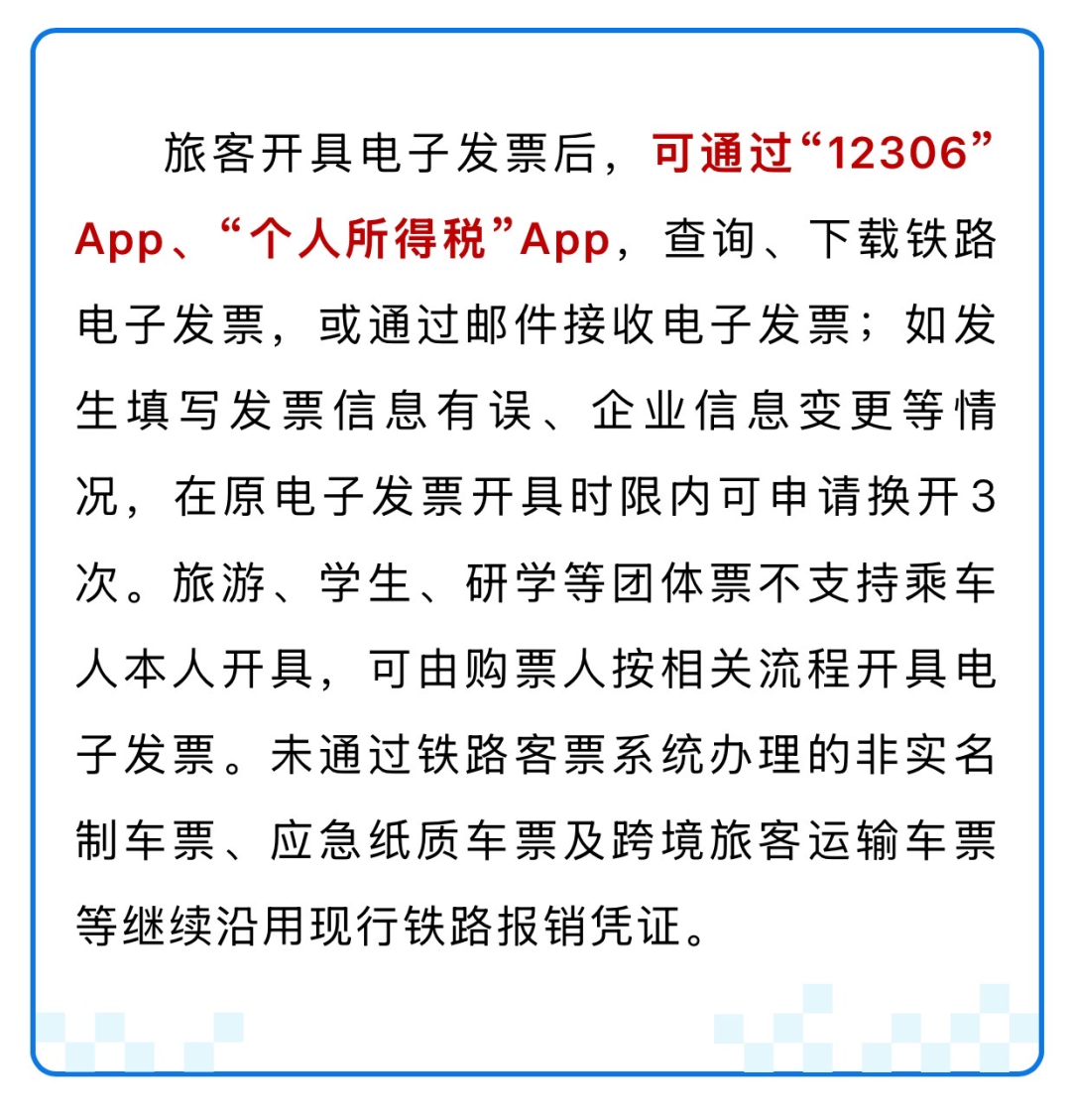 为保障老年人、脱网人士等不便操作的旅客群体获取电子发票,铁路部门增加线下申请渠道和购票(代办)人开具服务。