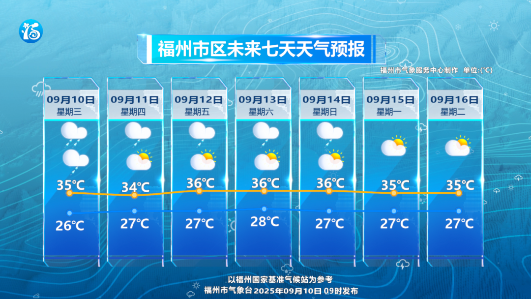 气温方面:未来一周内受副热带高压控制,福州各地持续高温天气。预计全市大部分地区最高气温可达(或超过)35℃,福州主城区最高气温可达37℃左右。秋天还很遥远,大家要继续做好和高温打持久战的准备!