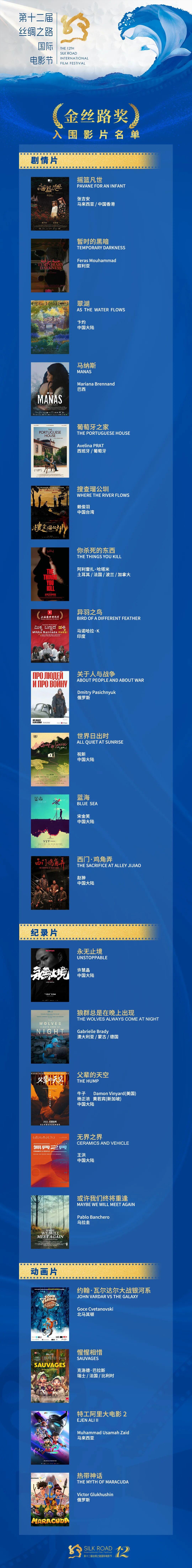 千年丝路绵延,文明交融互鉴;全球佳片云集,银幕绽放光彩。第十二届丝绸之路国际电影节再度启航,以电影为纽带,搭建起连接世界文化与情感的桥梁。本届电影节征片阶段反响热烈,共收到来自全球125个国家和地区的2856部参赛作品,所有影片共同角逐“金丝路奖”;经过专业评审团队的严格遴选与深度评议,最终有21部兼具艺术水准与思想内涵的杰出影片脱颖而出,成功入围终选名单,其中剧情片12部,纪录片5部,动画片4部。