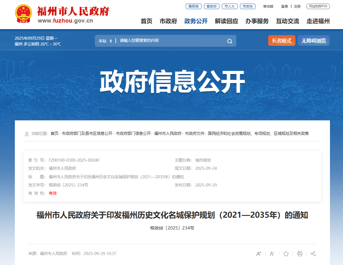 《福州历史文化名城保护规划(2021—2035年)》已经福建省人民政府批复同意,现印发给你们,请认真组织实施。
