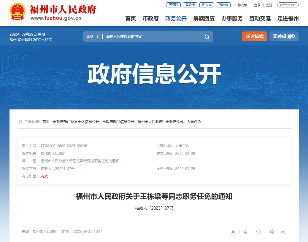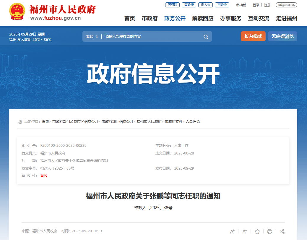 近日,福州市人民政府网站发布一批人事任免通知,一起来看——