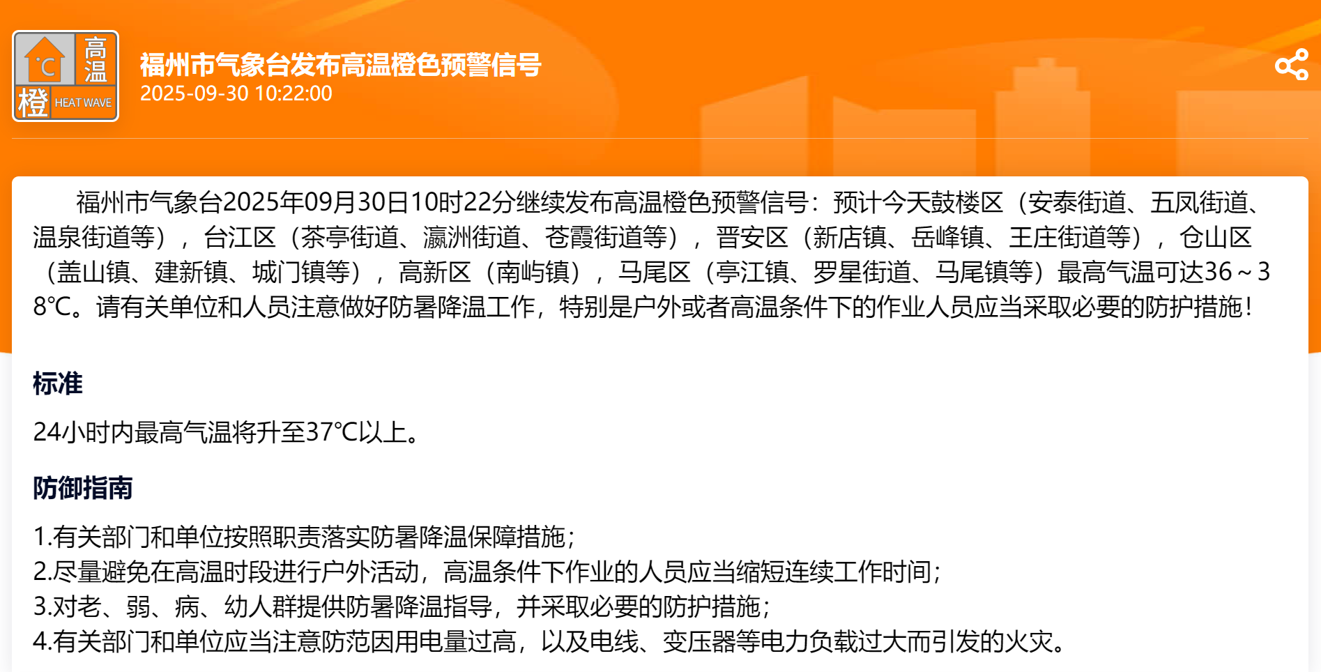 福建省大部分地区最高气温在35℃上下,福州5日最高气温甚至达38℃。福州市气象台2025年09月30日10时22分继续发布高温橙色预警信号:预计30日鼓楼区(安泰街道、五凤街道、温泉街道等),台江区(茶亭街道、瀛洲街道、苍霞街道等),晋安区(新店镇、岳峰镇、王庄街道等),仓山区(盖山镇、建新镇、城门镇等),高新区(南屿镇),马尾区(亭江镇、罗星街道、马尾镇等)最高气温可达36~38℃。请有关单位和人员注意做好防暑降温工作,特别是户外或者高温条件下的作业人员应当采取必要的防护措施!
