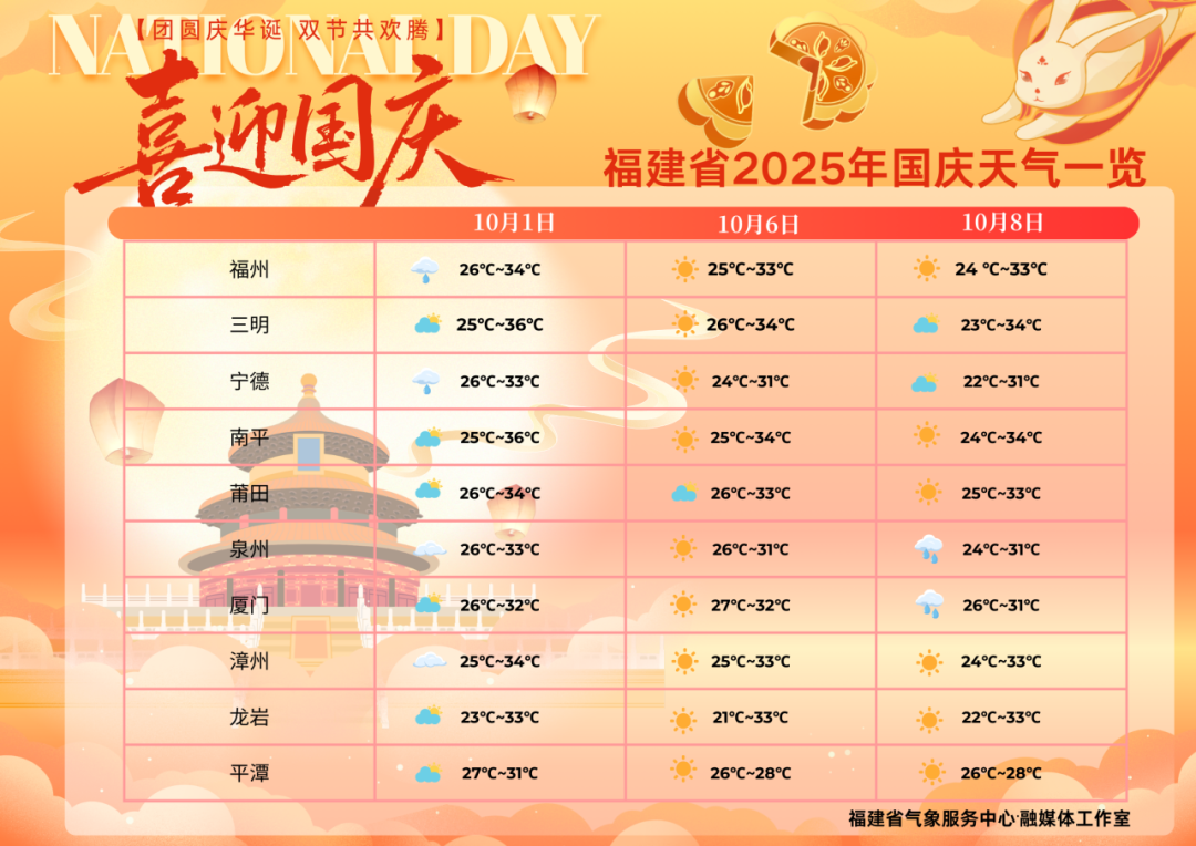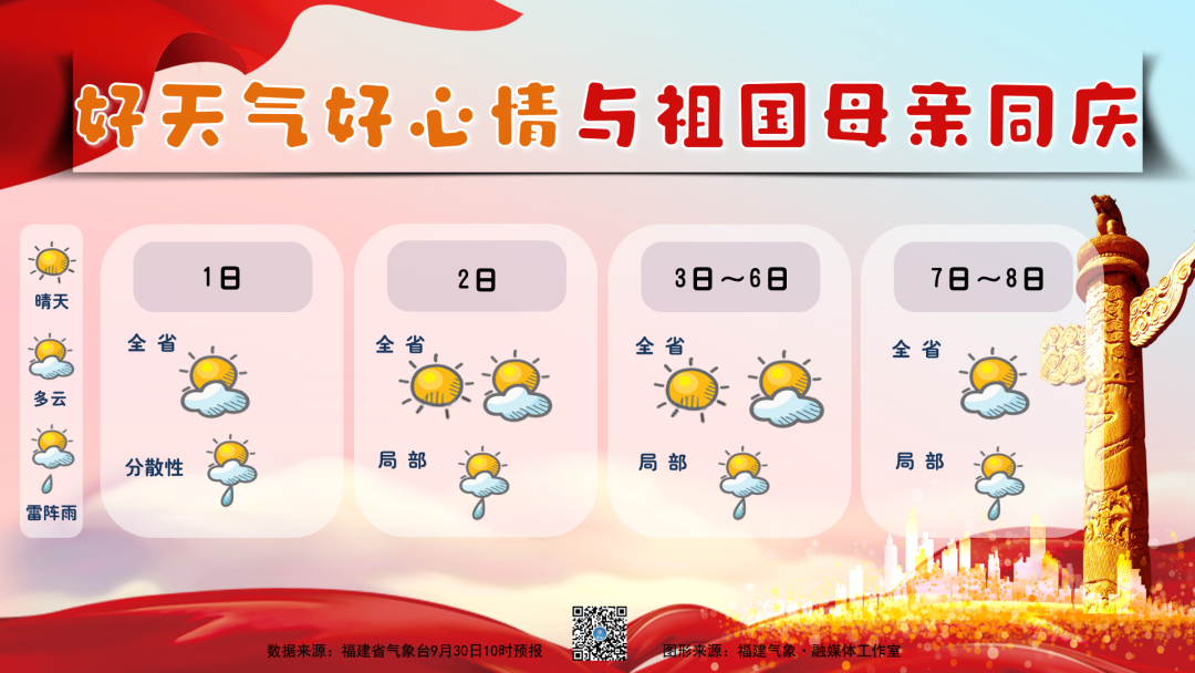 9月30日到10月1日全省多云,有分散性阵雨或雷阵雨,局部大雨。10月2日,全省晴到多云,局部有阵雨或雷阵雨。