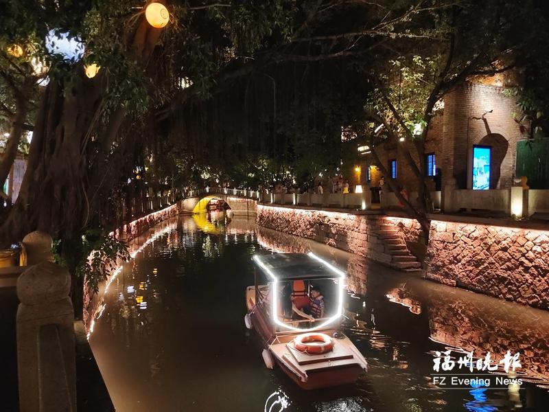 在福州市区,穿梭古今的水上诗画之旅成为主打。入夜后,游客们或泛舟白马河,或在三捷河畔怀旧……墙体光影秀与灯带勾勒出古桥轮廓,令人仿佛穿越回闽都水乡;古厝倒映水中,两岸灯笼初亮,比白天多了几分梦幻。福州内河的独特魅力,让来自各地的游客感受到独特的闽都风情。