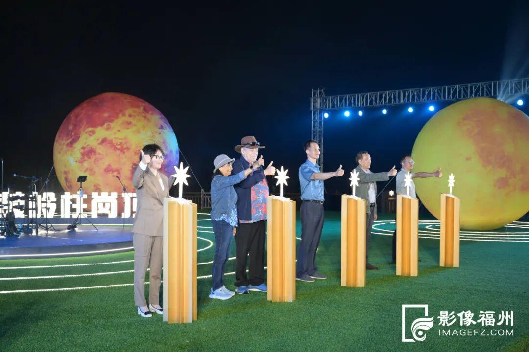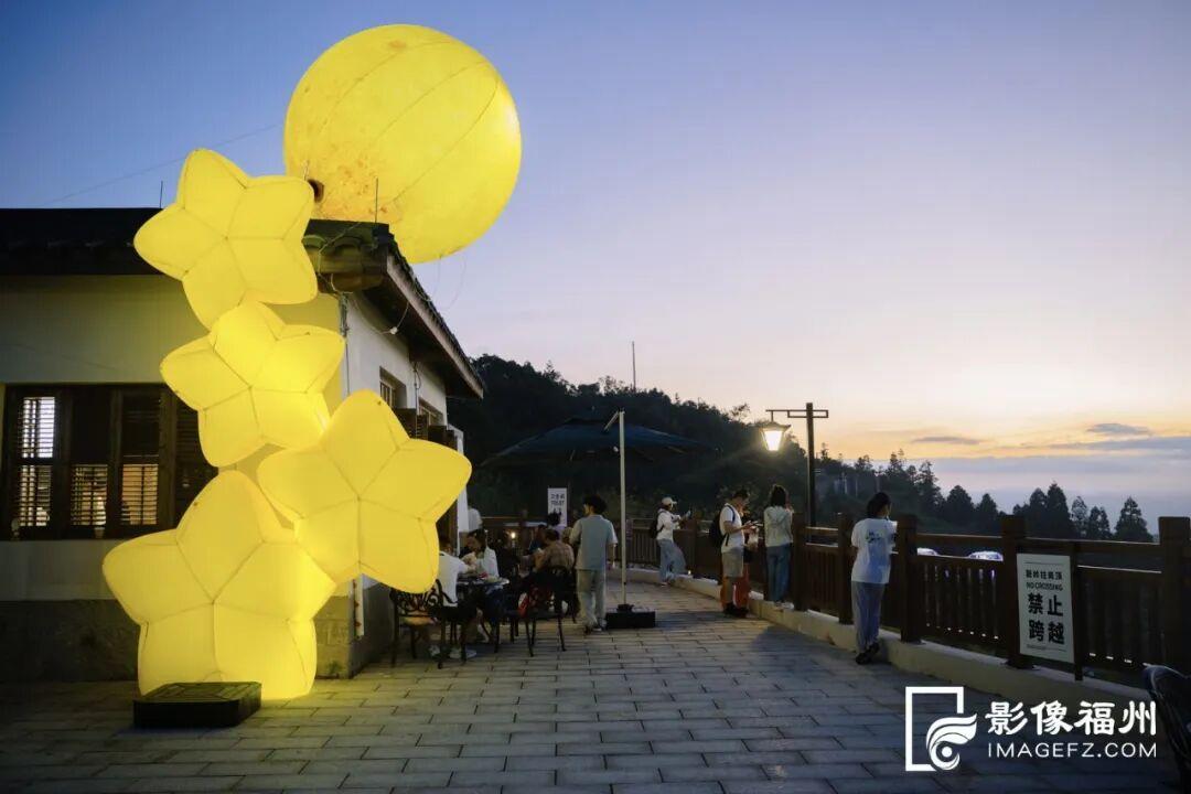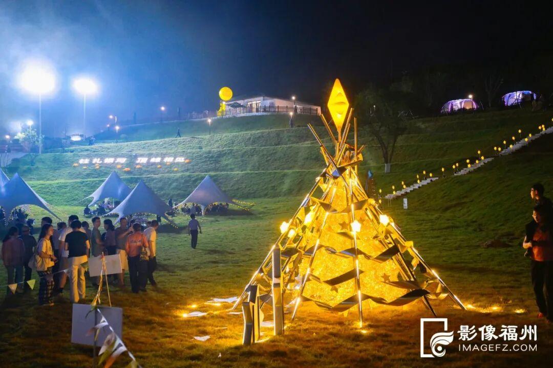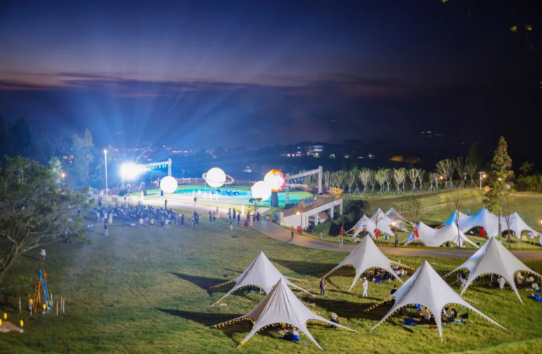 10月3日晚,舞台以“星轨银河”为背景,“鼓岭之友”程高登夫妇、张又新等嘉宾共同按下启动装置,瞬间点亮营区内所有星河美陈装置,银河光影步道顺着阶梯绿野“苏醒”,让人每一步都似踏在星河之上;星辰篝火装置燃起暖光,照亮游客笑脸,与远处城市灯火连成一片,瞬间将“天空之城”的浪漫拉满。
