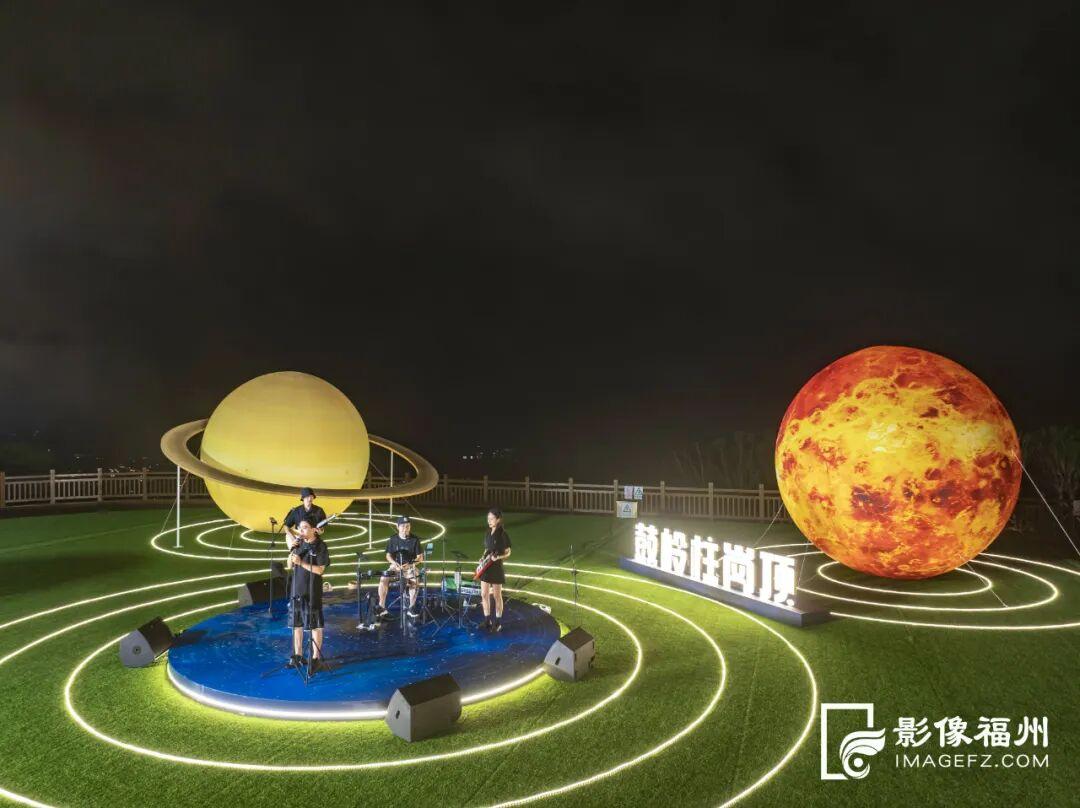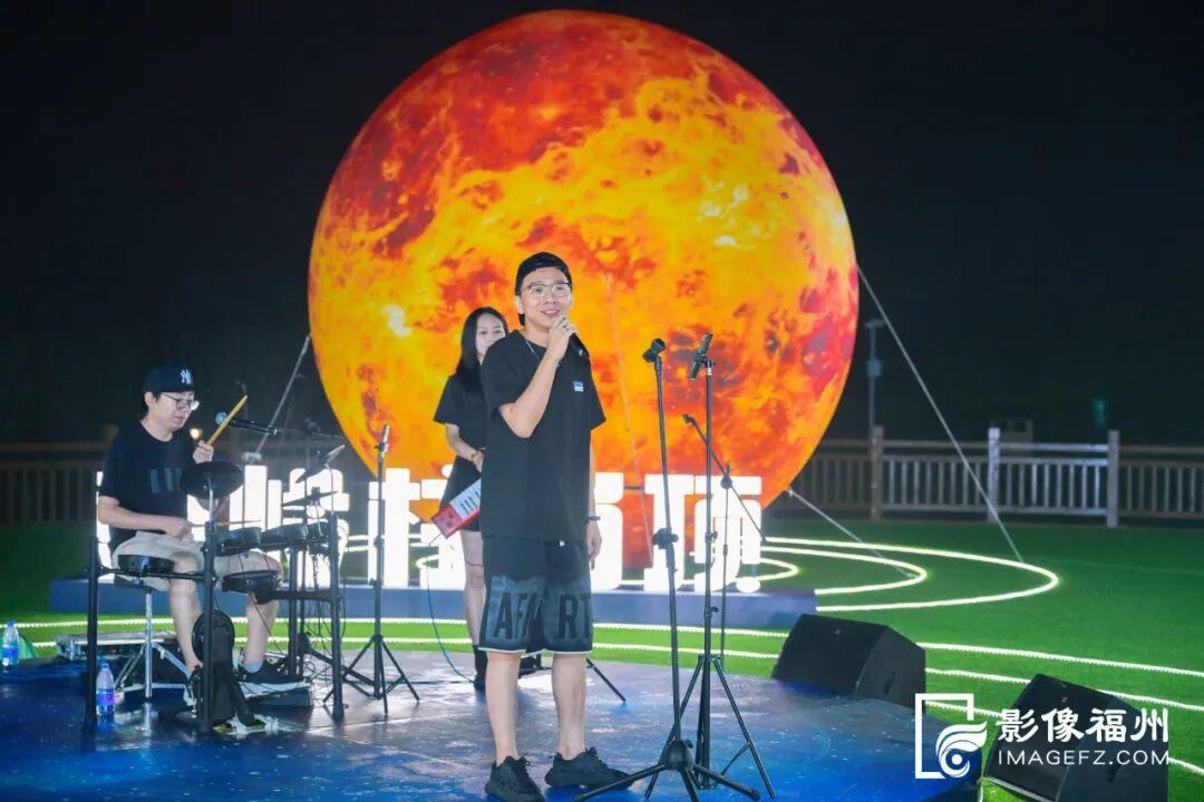 现场活动氛围热烈。篝火星辰、摘一颗星星送你、星河之路、绿色星光等互动打卡装置,吸引众多游客参加。随后,来自福州的自由乐队“小镜大山”登台献唱,以浪漫旋律与自然共鸣,奏响了一场别开生面的“星河音乐会”,让观众在音乐与星空的交织中度过难忘的夜晚。
