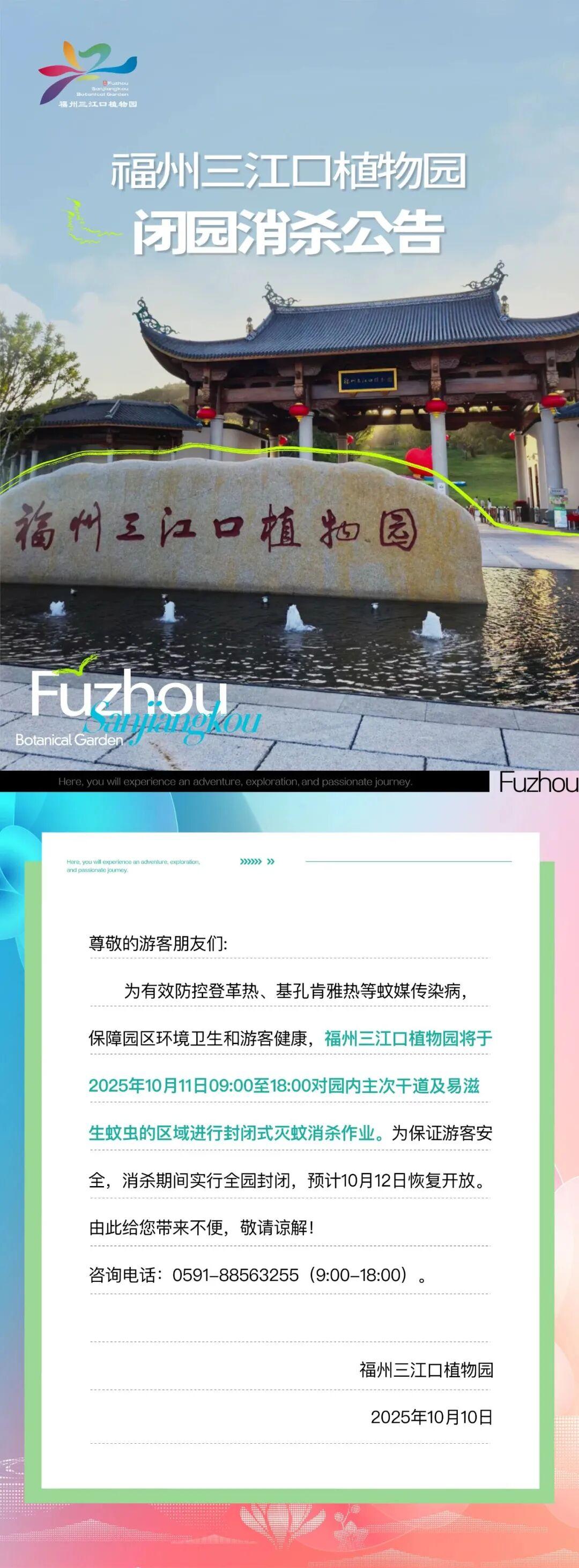 重要提醒!福州市茶亭公园和福州三江口植物园发布公告将对全园进行封闭式灭蚊消杀作业。