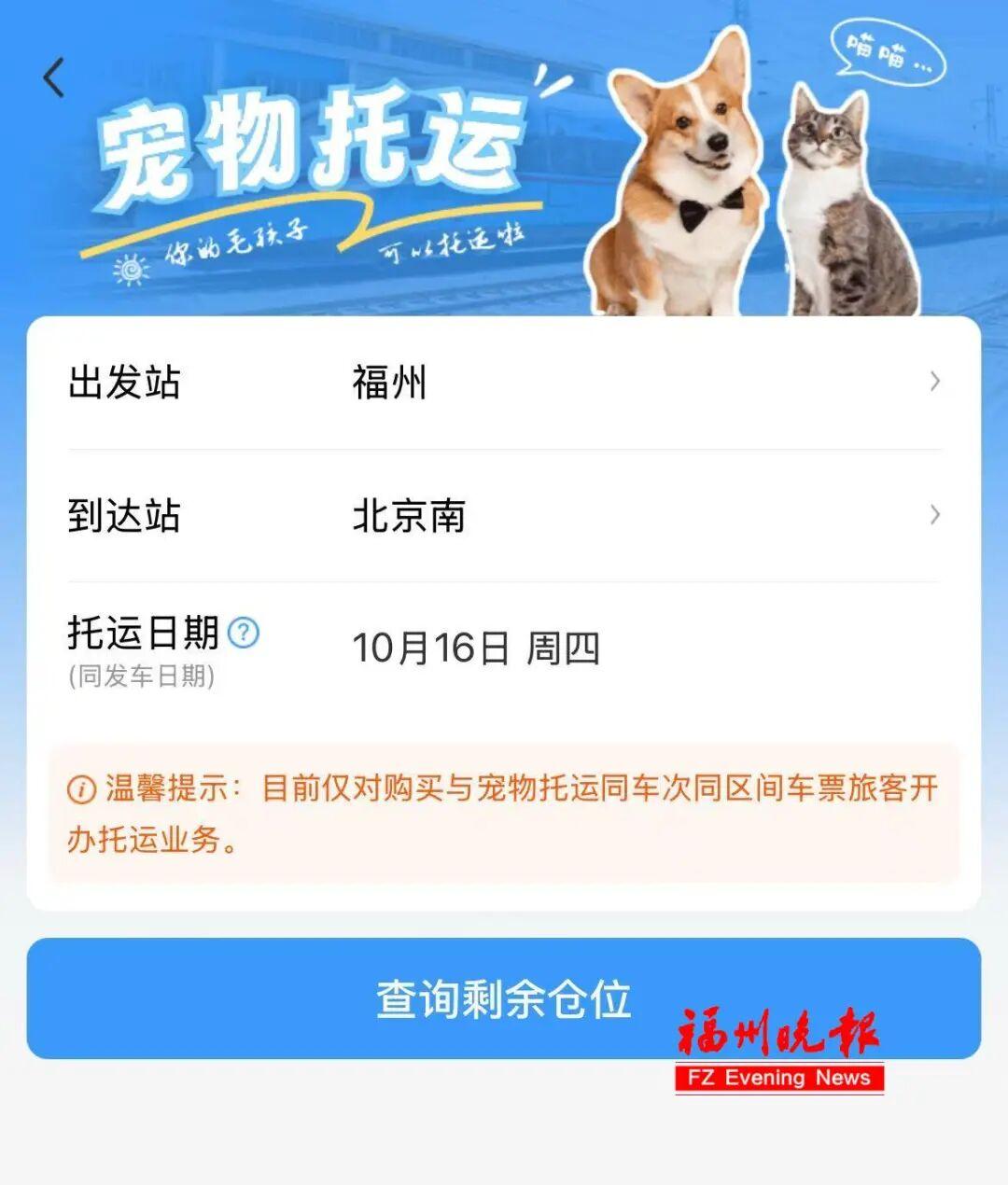 记者从中国铁路南昌局集团有限公司(下称“南铁”)获悉,为更好满足旅客携宠出行的需求,铁路部门自2025年10月15日起进一步扩大高铁宠物托运服务试点范围,在福州站、厦门北站新增高铁宠物托运服务。
