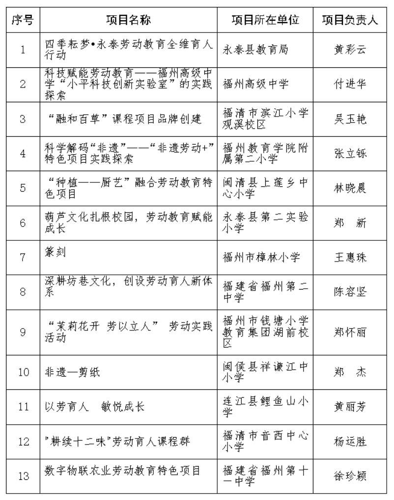 2025年福州市中小学劳动教育实践特色项目