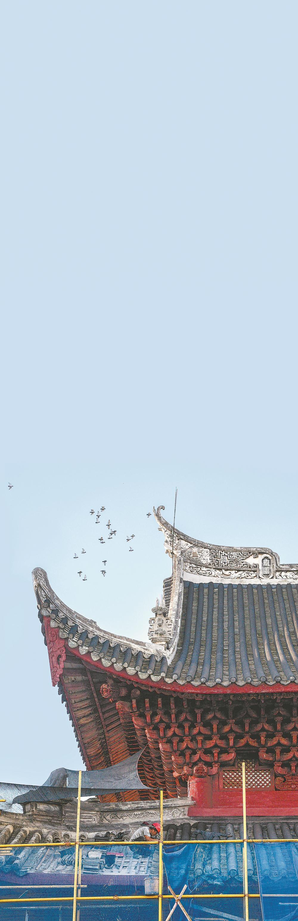 9月6日,福州文庙修缮现场,屋面上的泥瓦工弓着身沿陡坡为大成殿铺上新瓦。