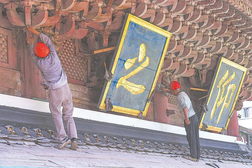 从屋面揭瓦、勘察、重新铺瓦,到屋身勘察、更换受损望板、檩条,再到地面加固构件、更换地砖,经历一年多的细致施工,大成殿终于在能工巧匠的精心修复下,逐渐重现往日气派。