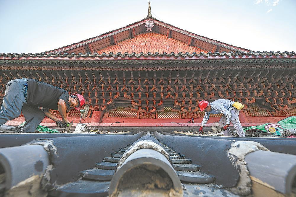 7月31日,木工在文庙大成殿屋顶对木构部件进行修缮。马志远 摄