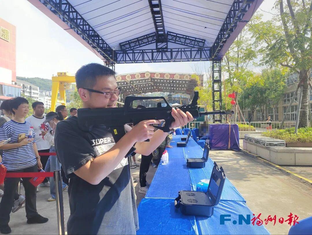 “9.5环”“9.8环”……现场有95式步枪和92式手枪1∶1仿真模型,市民游客在官兵指导下体验射击,报靶声此起彼伏。