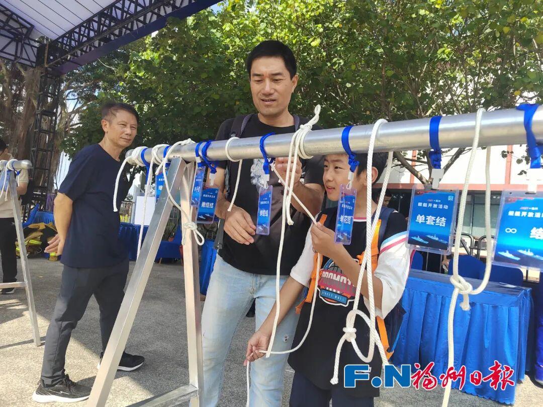 在海军绳艺体验区,官兵演示打丁香结、单套结、单花结、平结、水手结等十种海军常用绳结,参观者纷纷动手尝试。一名小朋友自豪地展示成果:“小小绳结凝结着代代海军的智慧,这些绳结在大家的日常生活中也大有用处。”
