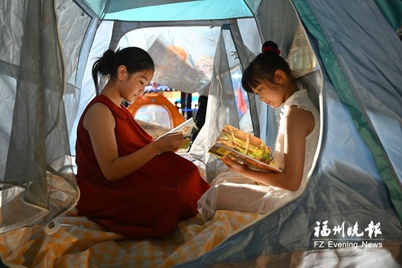 作为活动核心主场,“秋日帐篷露营”是当晚最引人注目的亮点。图书馆外场草坪上,30顶色彩缤纷的亲子帐篷错落搭建,每顶帐篷内贴心配备绘本、阅读灯具和舒适防潮垫,营造出温馨独特的“移动阅读角”。傍晚,孩子们迫不及待地拉着家长钻进帐篷,有的轻声读绘本,有的互相分享精彩故事,清脆笑声与翻书声交织。