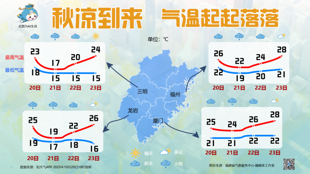 气温方面,21日起,我省大部城区日最高气温明显下降,内陆地区最高气温跌至20℃以下,昼夜寒意袭人。
