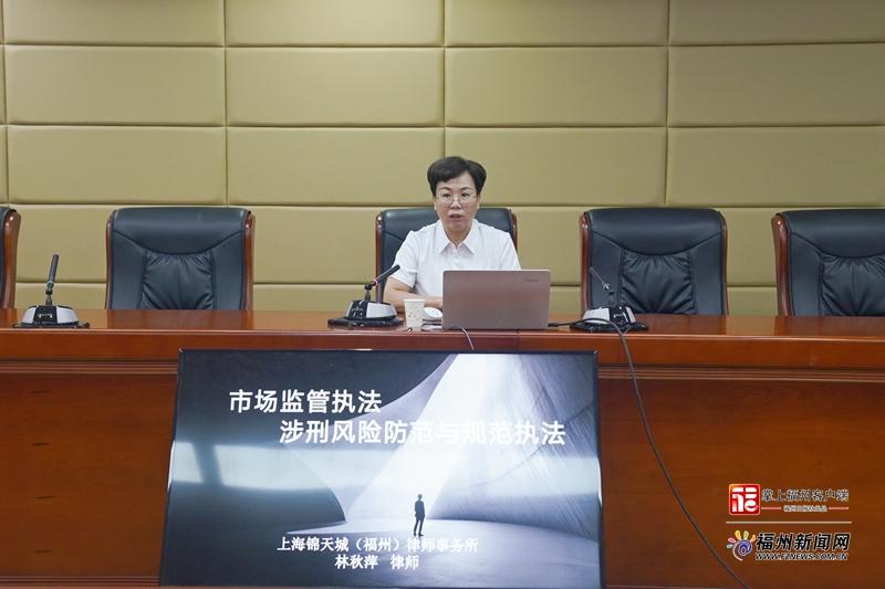 培训会邀请锦天城(福州)律师事务所合伙人林秋萍律师授课,以《市场监管执法涉刑风险防范与规范执法》为题,围绕“涉刑风险视角”“各领域刑责清单”“执法者刑责红线”“市场监管执法行为规范”等方面,对执法稽查业务及常态化扫黑除恶治乱工作进行了具体讲解。