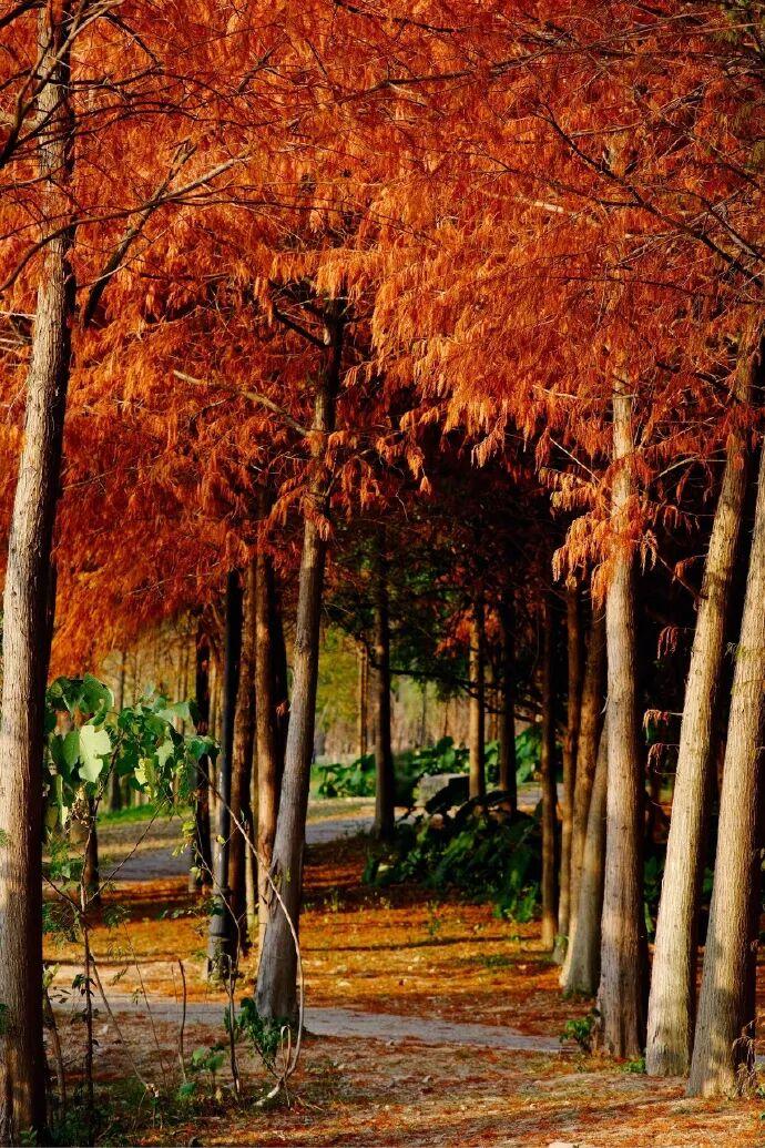 夕阳为水杉林镀上熔金,橘红树冠在公园里投下燃烧的倒影,绝美!
