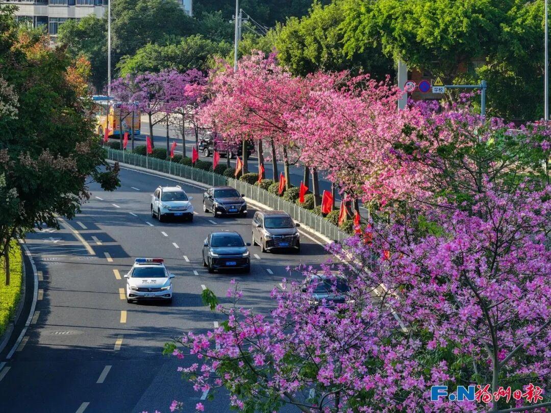 走在路上或开车路过,抬头便能看见“美人树”肆意绽放的花朵。