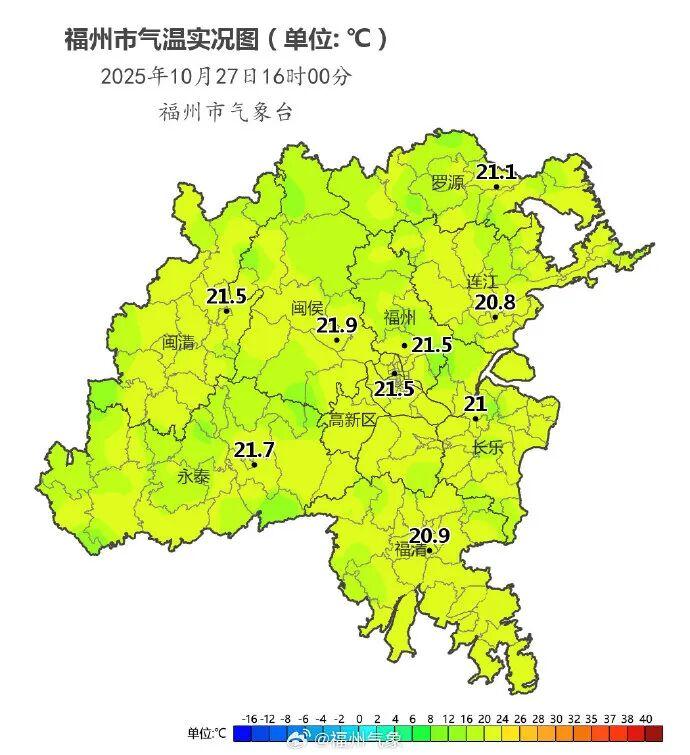 27日16时,福州市区气温21.5℃,比前一日降低了2.4℃。