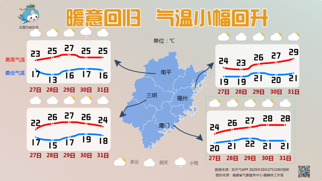 受冷空气南下影响,28日到29日福建全省多云到阴,局部有小雨,气温方面,未来几天随着冷空气势力减弱,气温将小幅回升。