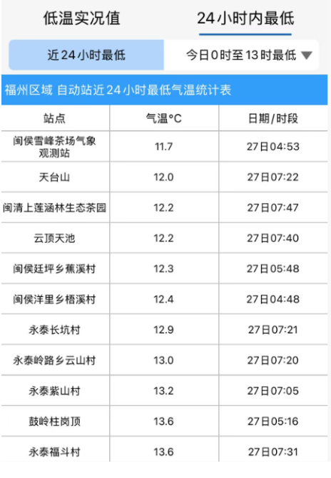 27日最低温出现在闽侯雪峰茶场气象观测站,为11.7℃。