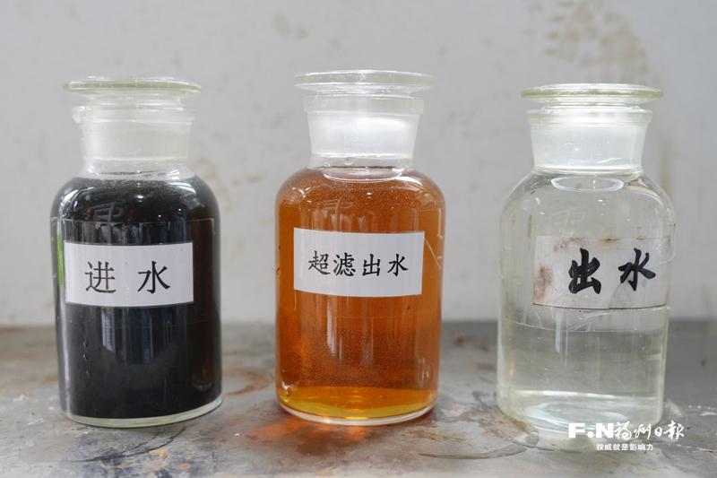 乌黑的垃圾渗沥液在经过多轮处理后,变成清亮的出水(再生水)。记者 包华 摄